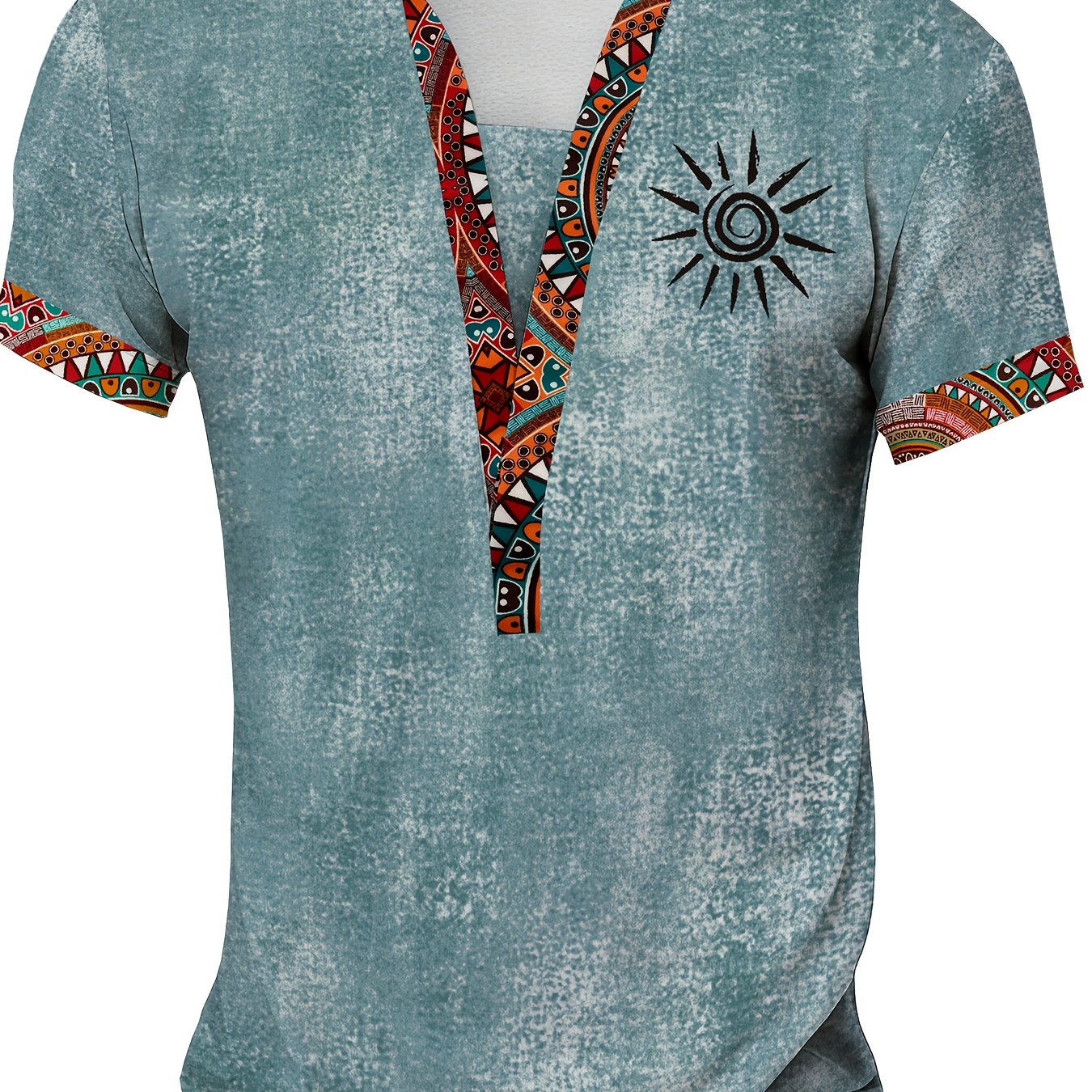 TEMU 남성용 캐주얼 V넥 반팔 티셔츠, 생생한 햇빛 프린트 디자인 - 가벼운 버튼업, 레귤러 핏, 캐주얼 복장, 캐주얼 여름옷, 프린트 티, 편안한 원단, 통기성 좋은 소재, 트렌디한 남성 패션,