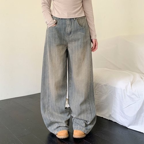 [숏,기본,롱/~3XL] 헤이나 스트라이프 사이드핀턱 스냅버튼 와이드 데님 팬츠 (2color)