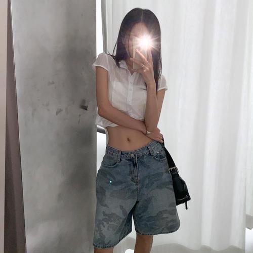 [옷자락]여자 힙무드 카모 워싱 버뮤다 데님 5부 팬츠