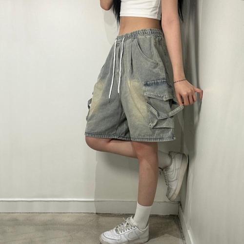 [신상오픈런]여성 스트리트 스타일 스티치 와이드핏 5부 데님 반바지