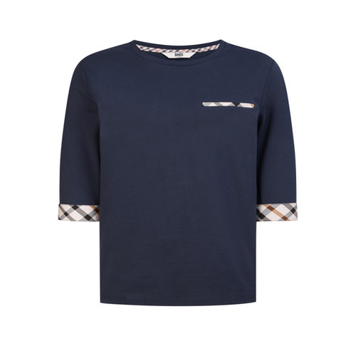 [스테디셀러]네이비 체크 배색 면혼방 7부 소매 티셔츠 (WKTS5BU01N2)