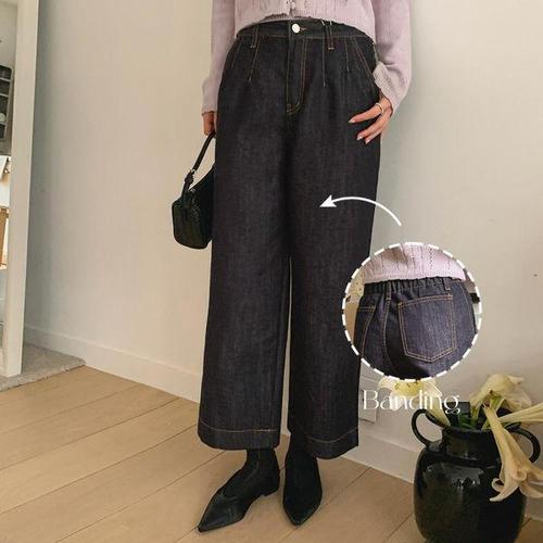 [옷자락] 여성 하이웨스트 와이드 진청 코튼 9부 데님팬츠