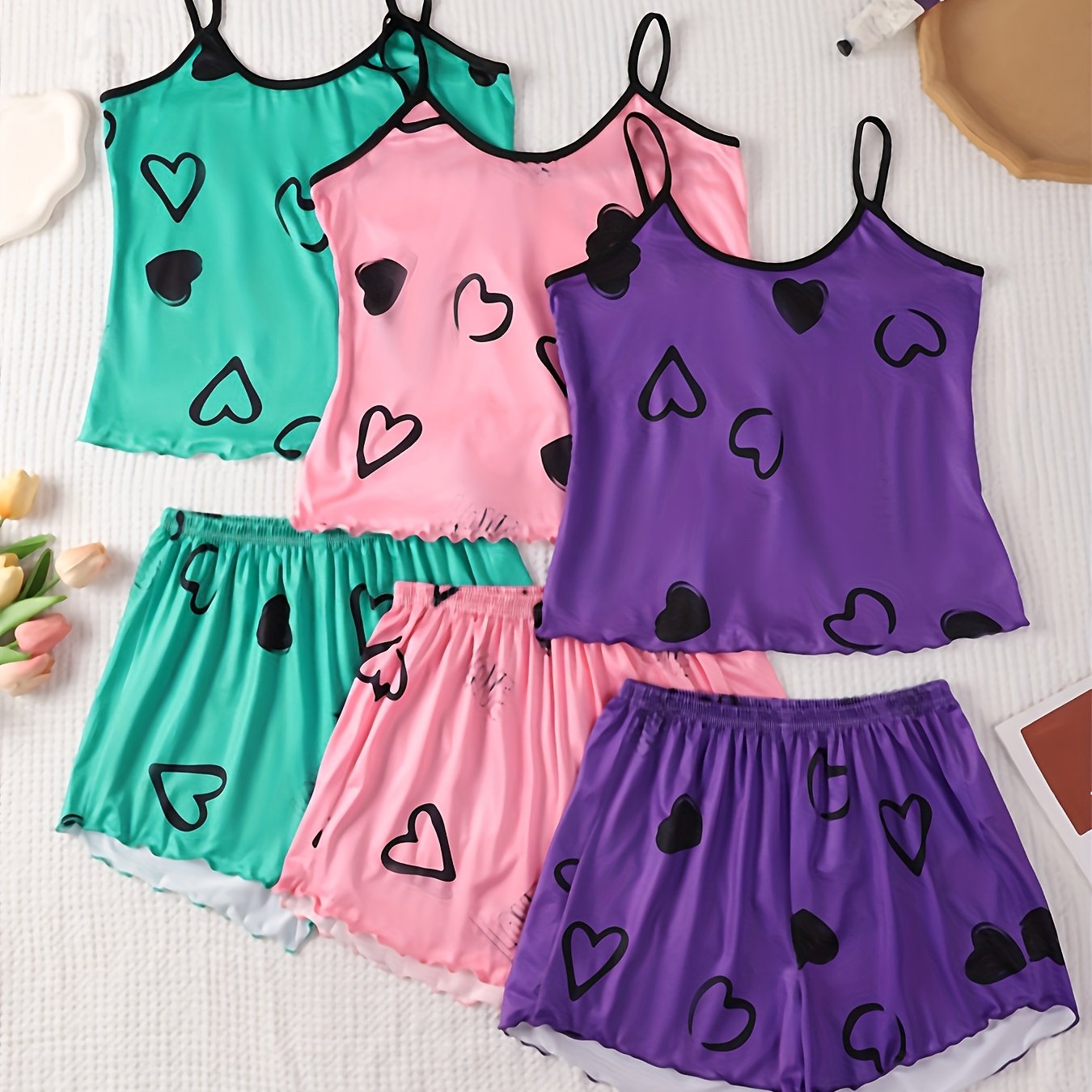 TEMU 3피스 스트레치 파자마, 섹시 레이스 트림 캐미솔 쇼츠, 테리 원단 리브드 크로스보더