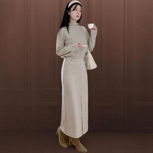 [신상오픈런]여성 클래식 울 도톰 슬릿 H라인 롱스커트