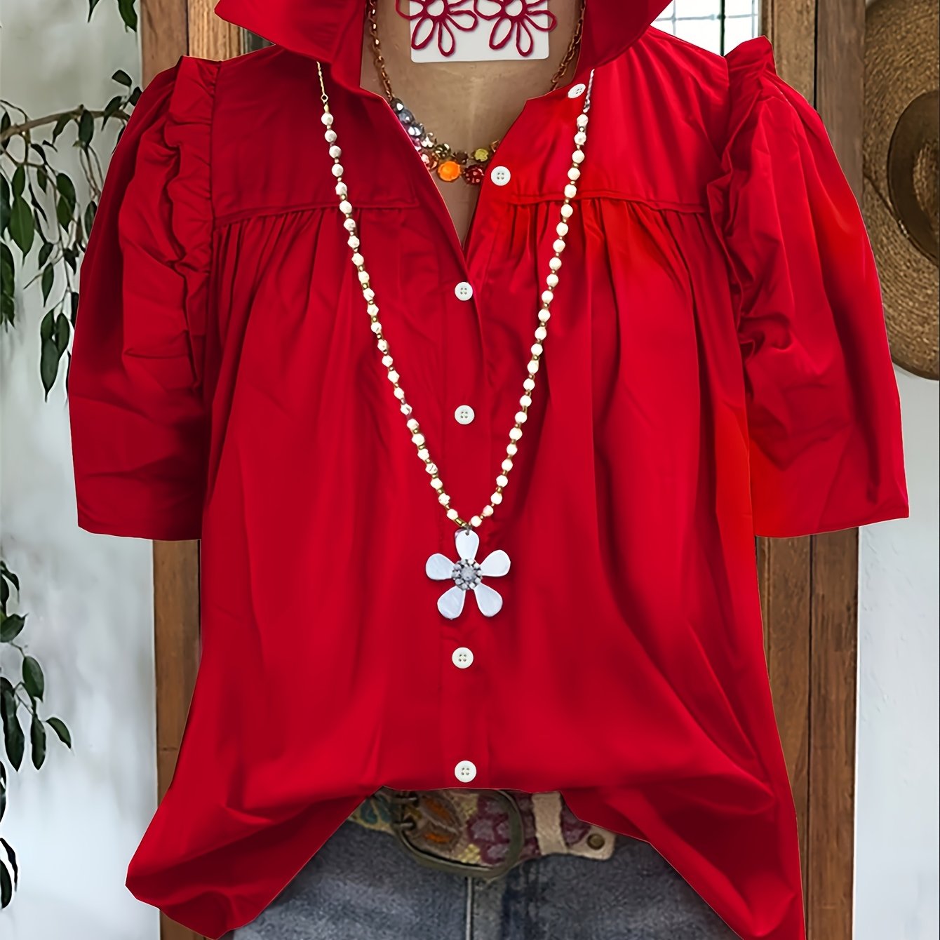 TEMU 우아한 방향성 캐주얼 V넥 블라우스, 러플 레이스 소매 - 솔리드 레드 반팔 셔츠 탑, 가볍고 세탁기 사용 가능, 봄 여름 가을 우아한 컬렉션