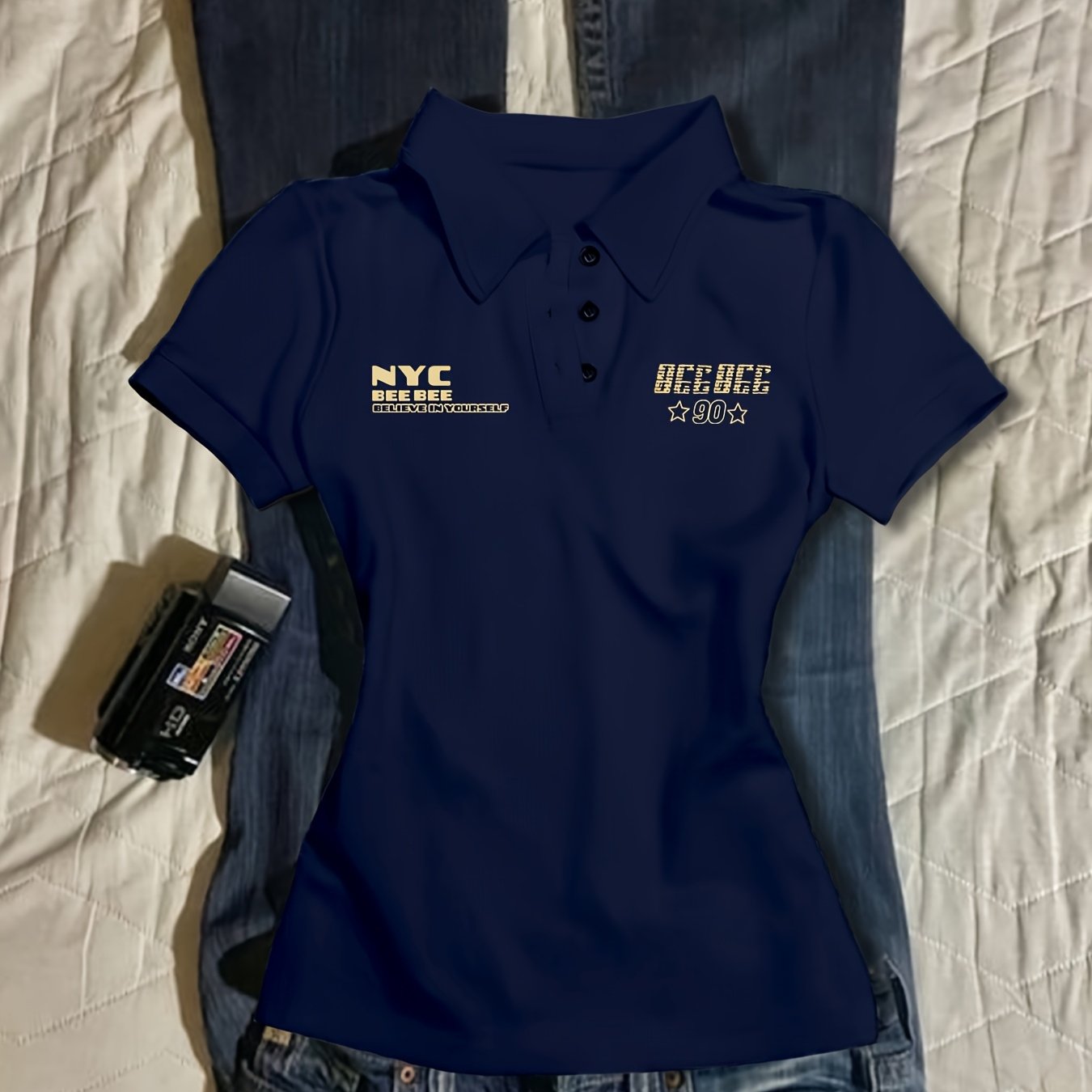 TEMU 여성용 Y2K 스타일 V넥 크롭 셔츠 - 반소매, 슬림핏, 네이비 블루, 캐주얼 디자인, 여성용 티셔츠