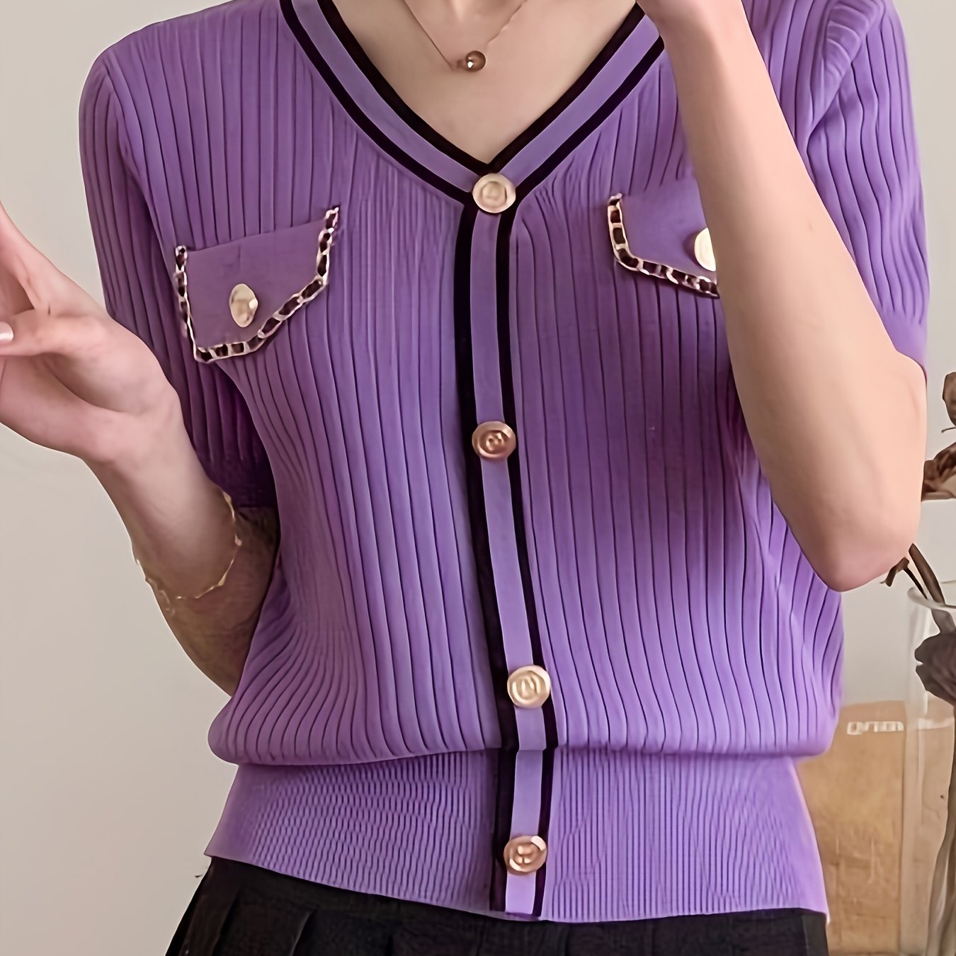 TEMU 우아하고 스타일리시한 신상 봄/여름 여성용 단색 브이넥 싱글 브레스티드 프렌치 스타일 기품 있는 허리 슬림핏 체형 보정 활용도 높은 반팔 티셔츠 ASD1