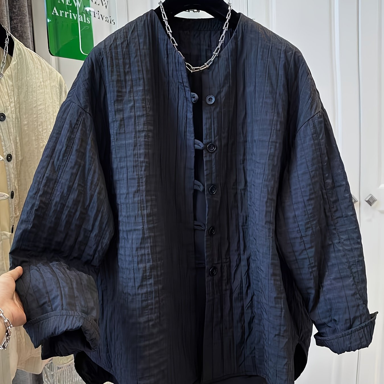 TEMU 여성용 빈티지 스타일 루즈핏 긴팔 재킷, 수직 줄무늬 - 시크한 버튼업 프론트, 라운드 넥, 단색, 봄/가을 캐주얼 아우터웨어, 봄 아우터웨어 | 빈티지 재킷 | 버튼업 재킷