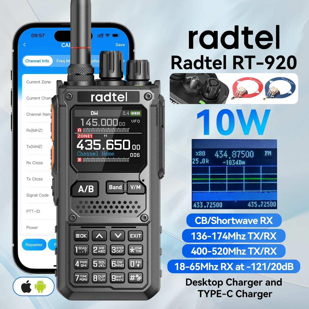 Radtel RT-920 멀티 밴드 햄 라디오 프로그래밍 가능 CB 라디오 (블루투스 앱 지원) UHF VHF HF SSB AM USB LSB CW 960채널 2200mAh 배터리
