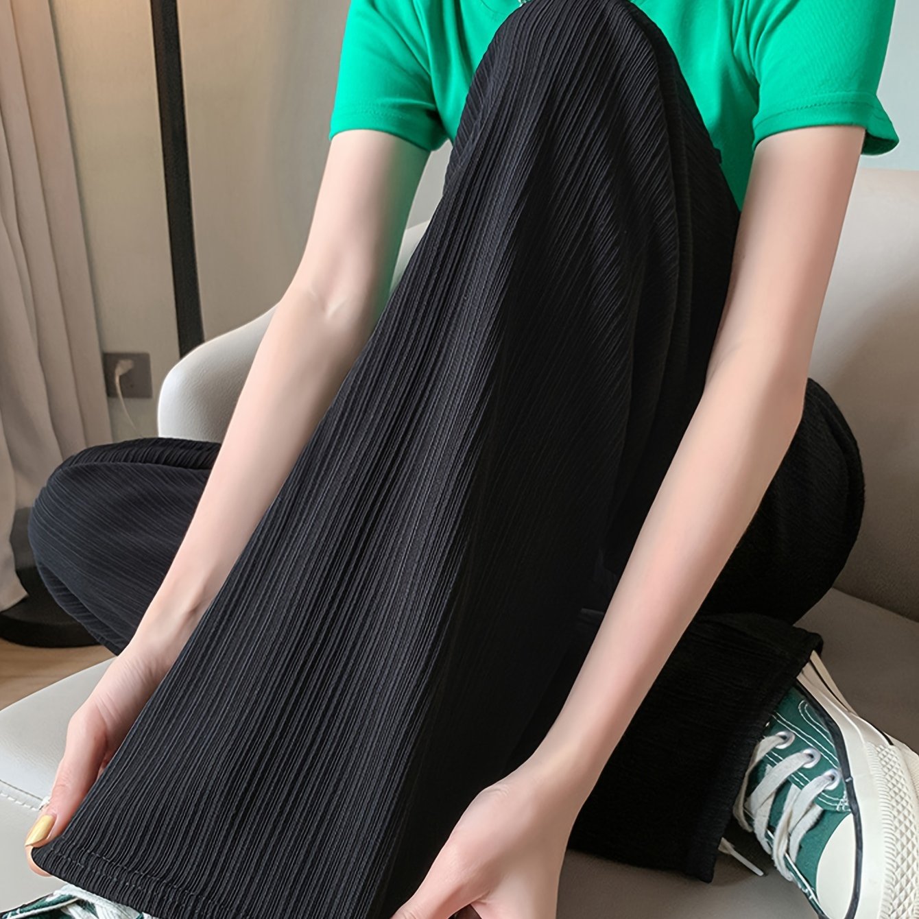 TEMU 여성용 하이 스트레치 아이스 슬리키 파이버 와이드 레그 팬츠 - 얇은 줄무늬 캐주얼 트라우저, 릴랙스 핏 & 사계절 편안함, 짐나사움, 긴 길이, 우아한 스페셜 컬렉션, 유동적인 실루엣, 비침 방지 원단