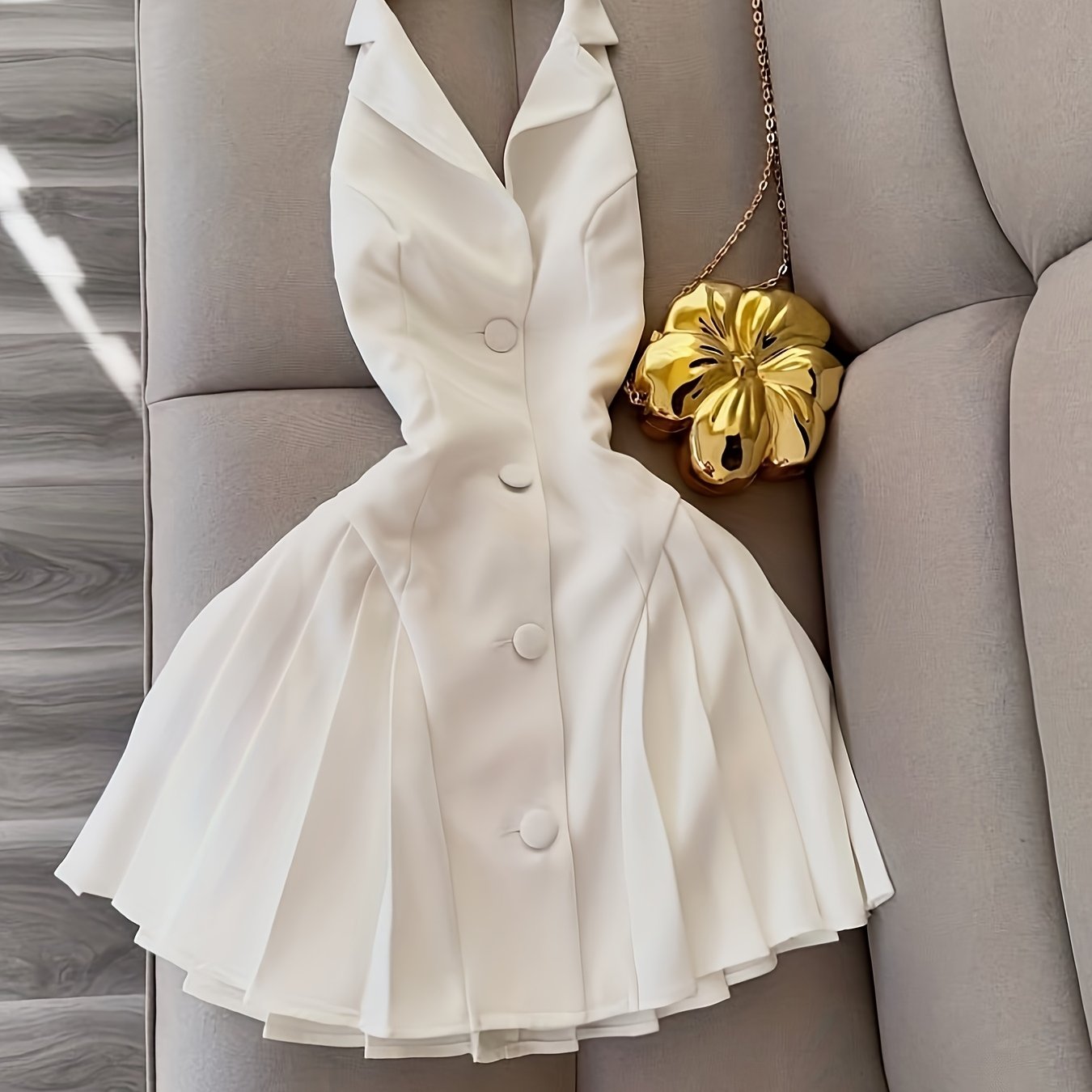 TEMU 세련된 A라인 플리츠 민소매 원피스, 버튼 앞면 및 홀터넥 | 단색, 사계절용, 성인 여성에게 이상적