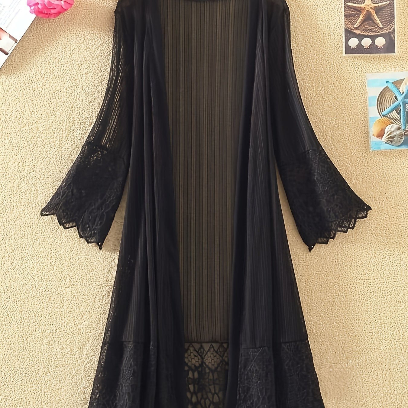 TEMU 플러스 사이즈 - 플러스 사이즈 - 플러스 사이즈 여성 솔리드 메쉬 3/4 소매 롱 가디건 숄 레이스 재킷 코트