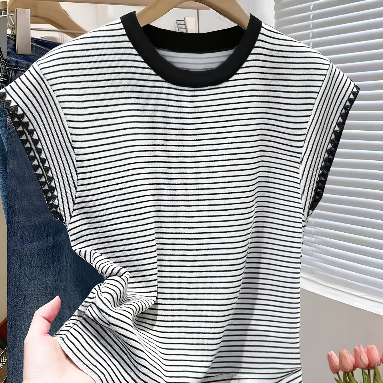 TEMU 여성용 우아한 티셔츠, 스플라이스드 라운드 넥 & 소매 - 세로 줄무늬 블라우스형 탑, 중간 신축성, 사무실, 세미 정장, 캐주얼 의상용, 기계 세탁 가능