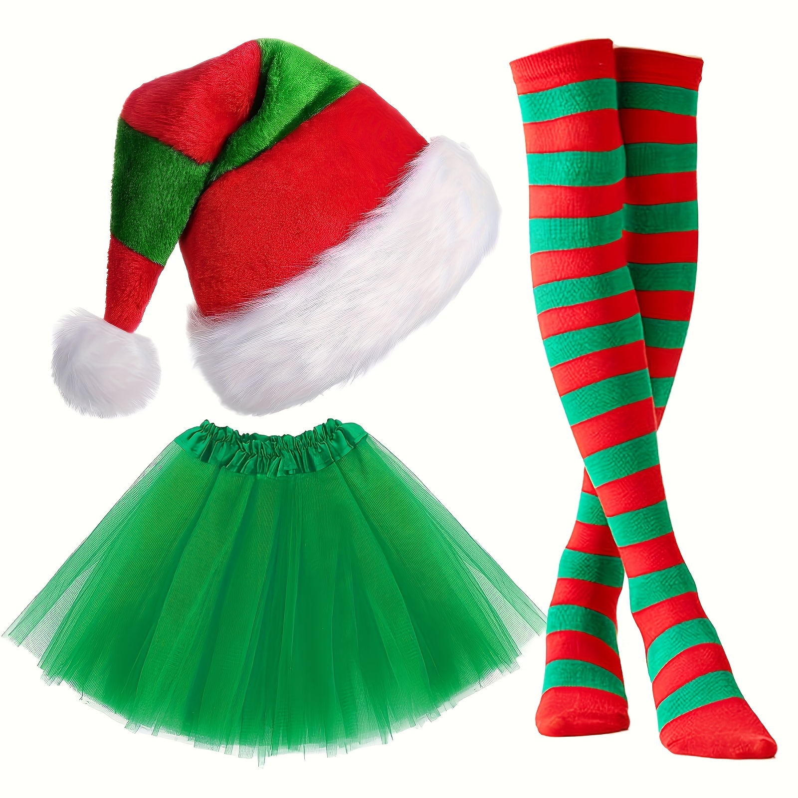 TEMU 크리스마스 엘프 코스튬 세트 3pcs (크리스마스 모자, 스커트, 줄무늬 하이삭스 포함), 빨간색과 초록색 파티 코스튬, 부드러운 폴리에스터 소재, 손세탁 가능, 여성용 크리스마스 축제 코스튬, 크리스마스 의상, 의상