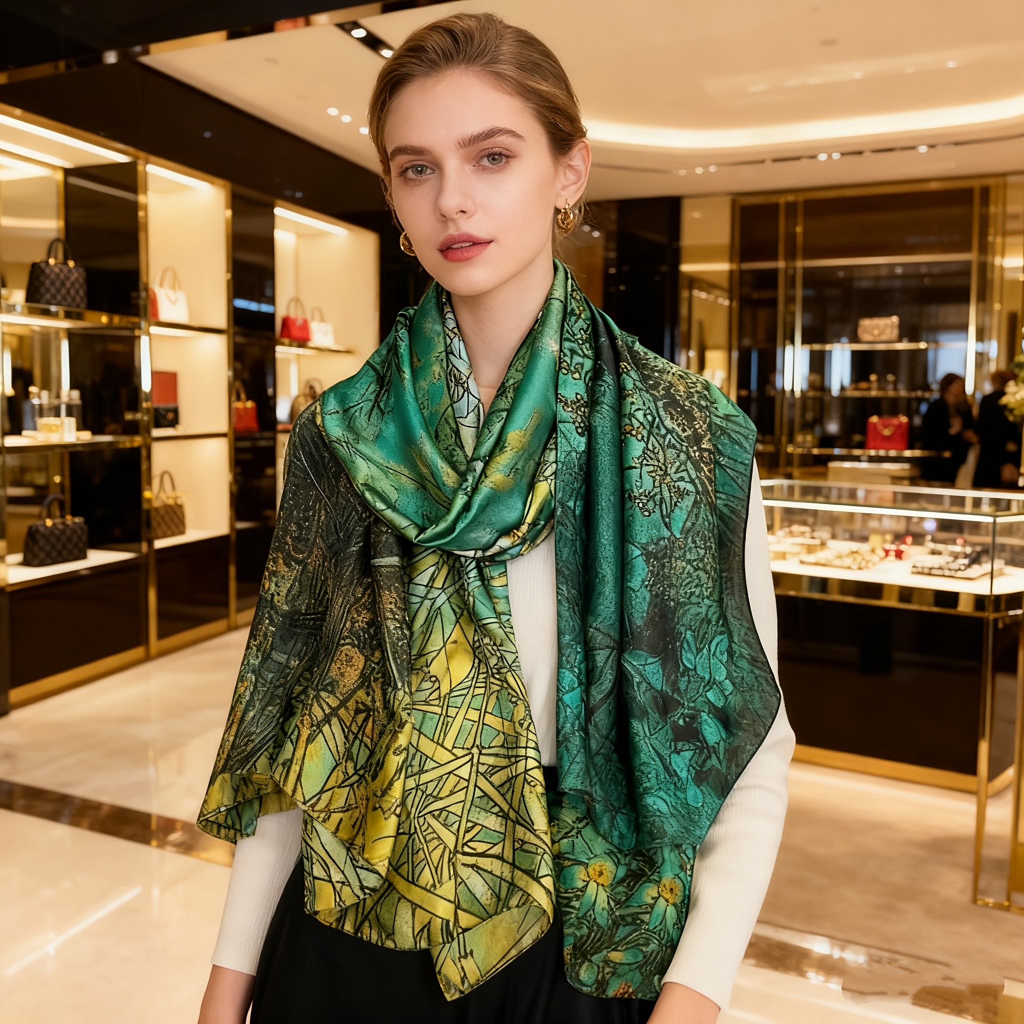 TEMU 35.4인치 화려한 플로럴 프린트 새틴 스퀘어 스카프 - 스타일 & 방풍 통기성 폴리에스터 스카프, 가벼운 여행 및 캐주얼 액세서리, 매끄러운 새틴 마감, 대담한 컬러 컨트라스트, 세련된 외관