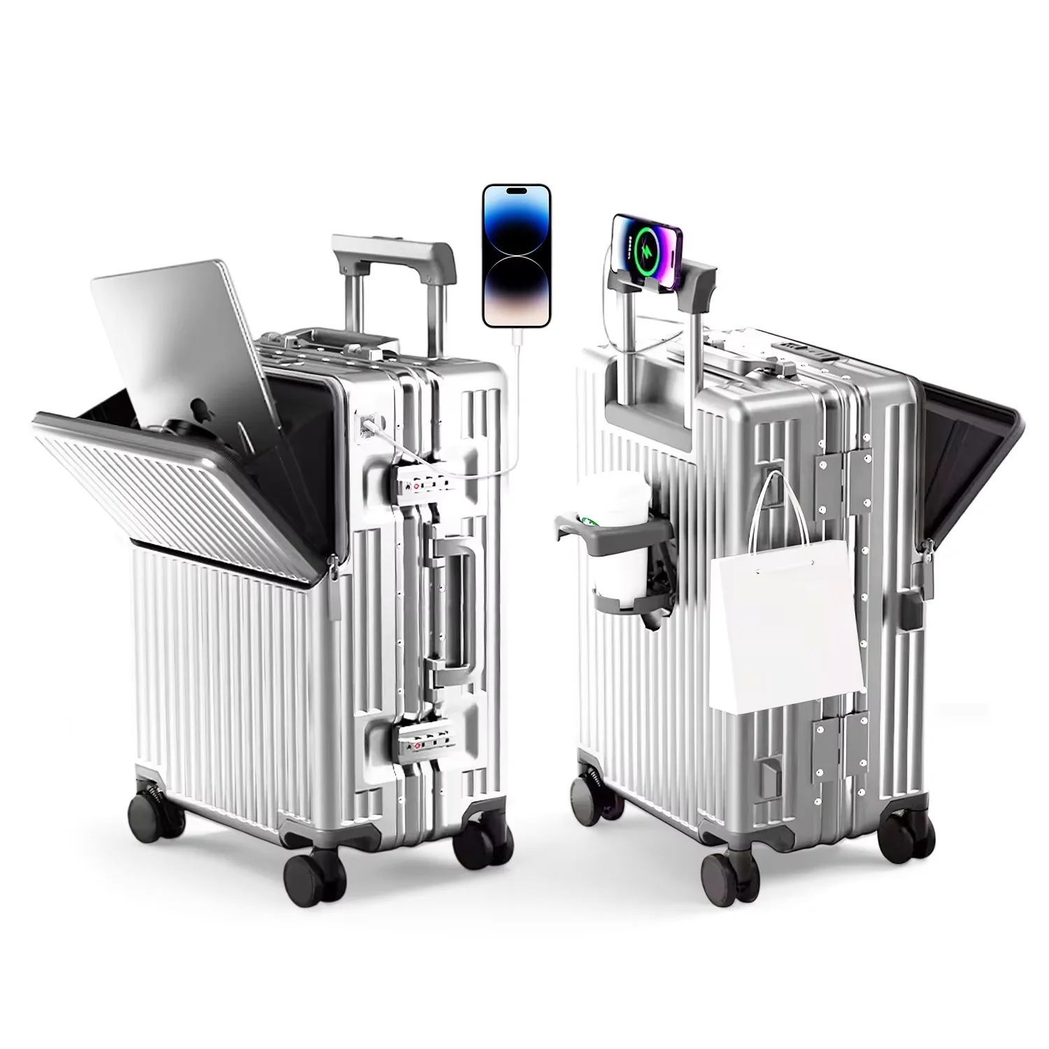 알루미늄 마그네슘 합금 프레임 PC 여행 가방, 3:7 분할, 무소음 바퀴, TSA 잠금장치, 컵홀더, 기내 반입 가능 여행용 캐리어