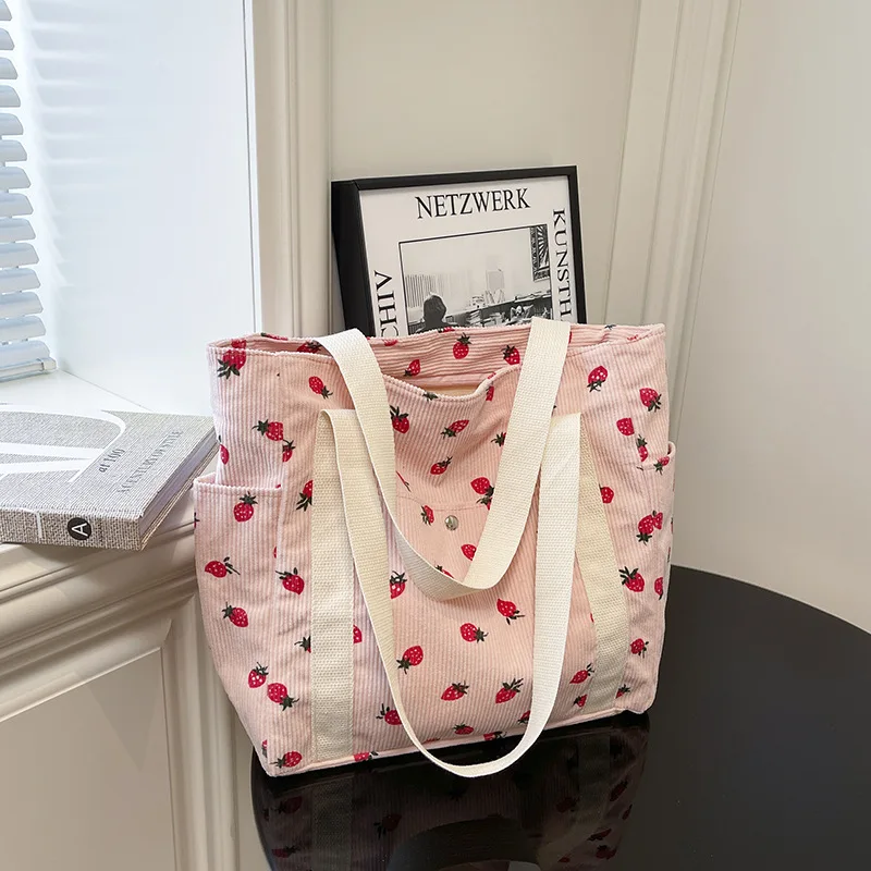 딸기 코듀로이 휴대용 접이식 가방 새로운 대용량 캐주얼 프린트 보관 가방 패션 여행 탑 핸들 가방 도매