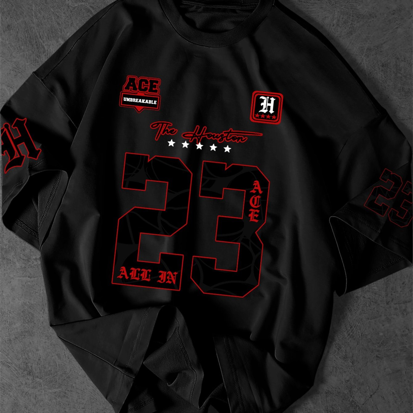 TEMU 남성 유럽 및 미국 트렌디 스트리트 스타일 티셔츠. '23'과 'The Houston' 그래픽이 특징이며, 친구들과의 모임, 캐주얼 외출, 야외 스포츠에 적합합니다. 세탁기 사용 가능.