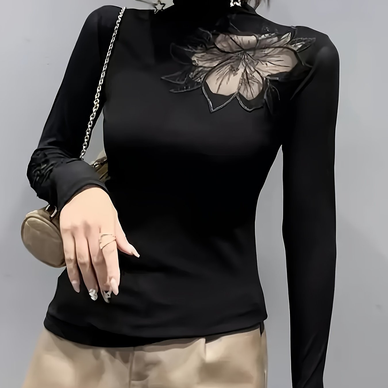 TEMU 여성용 레이스 하이넥 티셔츠, 봄/가을에 적합, 스타일리시하고 매력적, 길이, a 소재, 플로럴 패턴, 편안하고 신축성 있는 원단, 코바늘 디테일