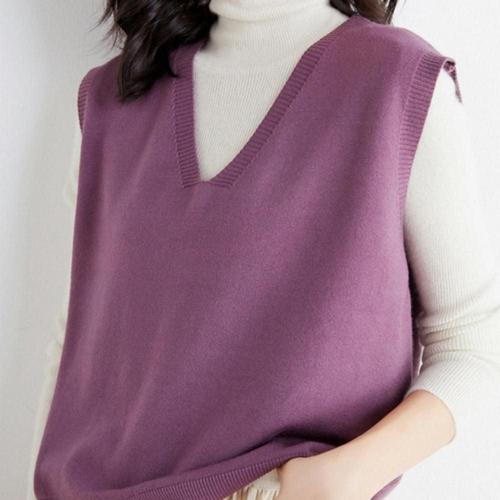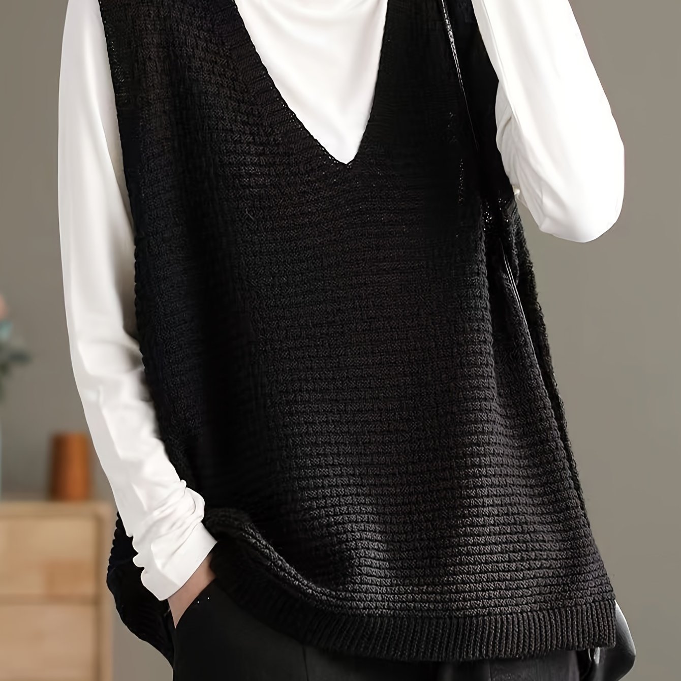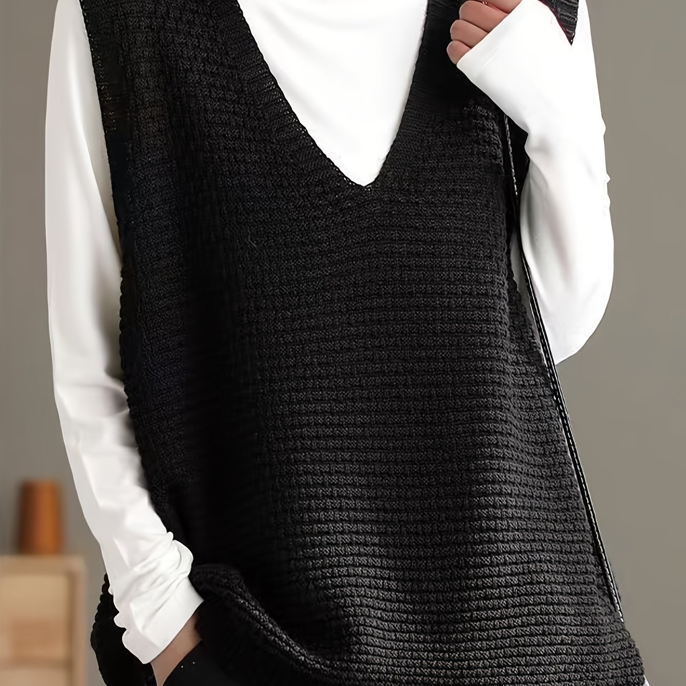 TEMU 단색 브이넥 니트 조끼, 캐주얼 무소매 루즈 스웨터, 여성 의류