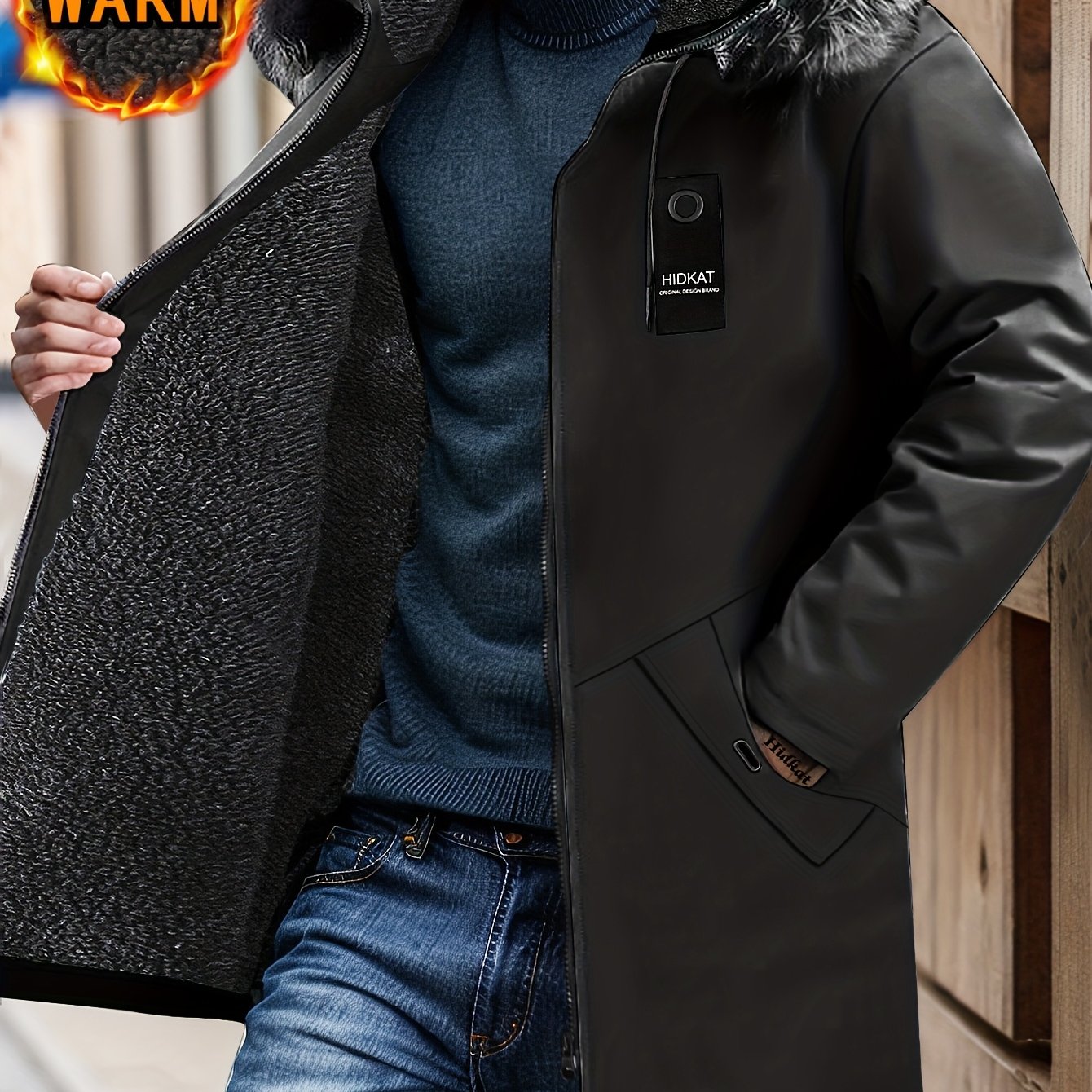 TEMU 겨울 남성용 루즈핏 후드 재킷 | 패셔너블한 기모 안감 두꺼운 미디 길이 코트, 지퍼 포함, 야외 레저 및 캠핑에 적합 | 브랜드: HIDKAT