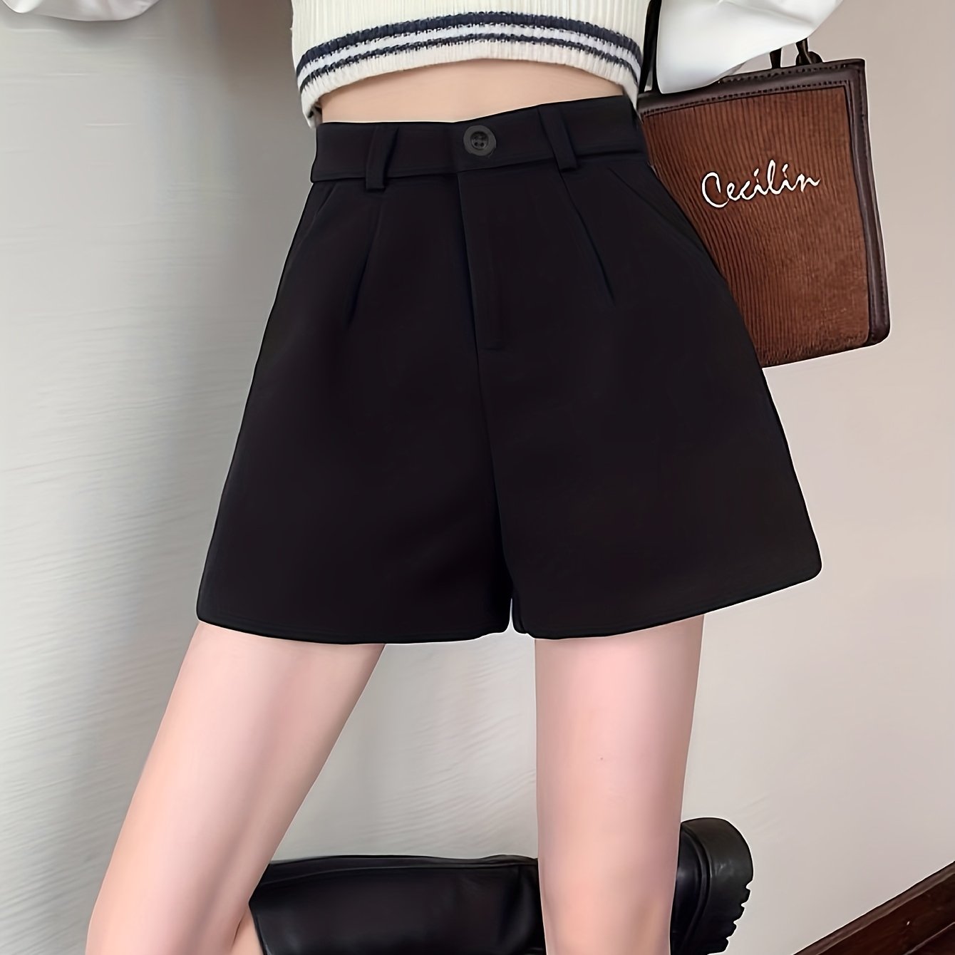 TEMU 봄 및 여름용 단색 고허리 턱 들어간 반바지, 여성용 캐주얼 슬랜트 포켓 반바지