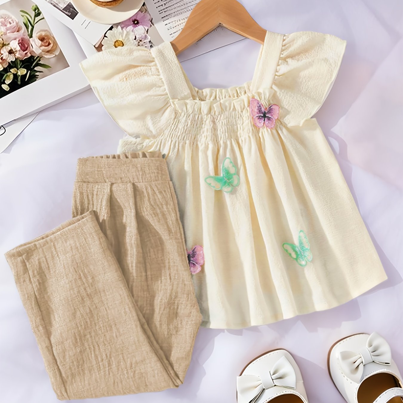 TEMU 2pcs/세트 여아용 바지 세트, 라펠 대비 색상 캐미솔 및 체리 프린트 바지, 사랑 체리 자수 배지 포함, 및 외출복으로 적합한 트렌디한 봄/여름 의류, 여아 선물용으로 적합, 야외 활동에 적합