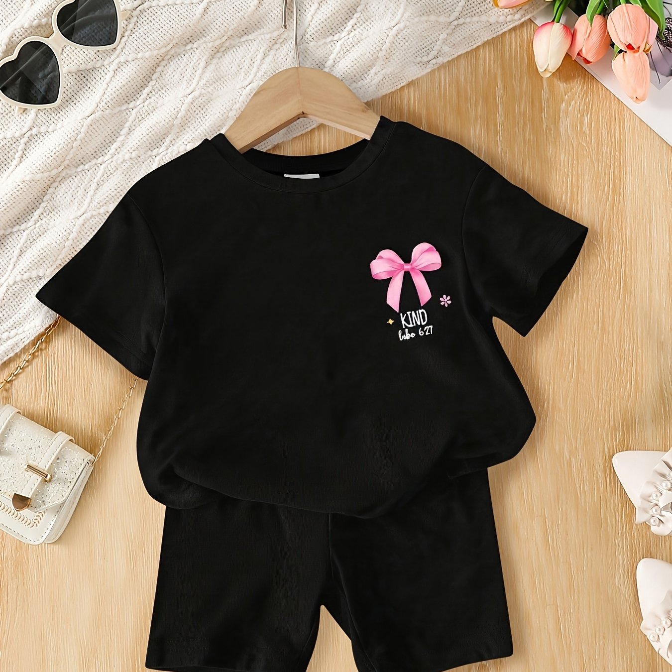 TEMU 여아용 패셔너블하고 심플한 여름 반바지 세트 2개: 앞뒤 보우노트 하트 프린트 라운드 넥 니트 반팔 티셔츠 + 블랙 신축성 허리밴드 바지 세트. 야외 휴가, 파티, 데일리 캐주얼웨어용 다용도 아동복. 편안하고 부드러우며 통기성이 좋고 땀을 흡수하는 여름 의류, 6개월-3세 유아용, 야외 활동에 적합