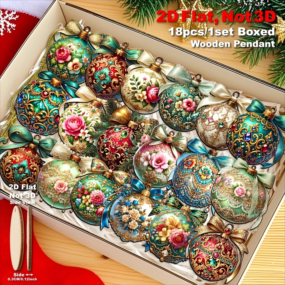 TEMU 2D 플랫, [2D Flat] 18개/1세트 고급 빈티지 크리스마스 장식 볼, 목재 펜던트 및 토퍼 | 크리스마스 트리, 새해, 카니발, 휴일 장식 | 홈/오피스/파티/창문 디스플레이, 벽난로, 현관용 장식, 2D Flat
