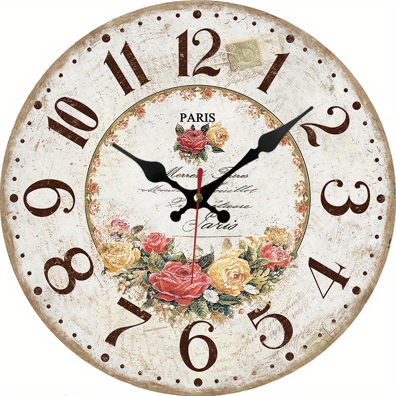 TEMU 나무 벽시계 1개, 빈티지 큰 숫자 무소음 원형 벽시계, 소박한 스타일 꽃무늬 시계, 모던한 벽걸이형 가정 장식 시계, 거실 및 침실용 벽걸이 시계