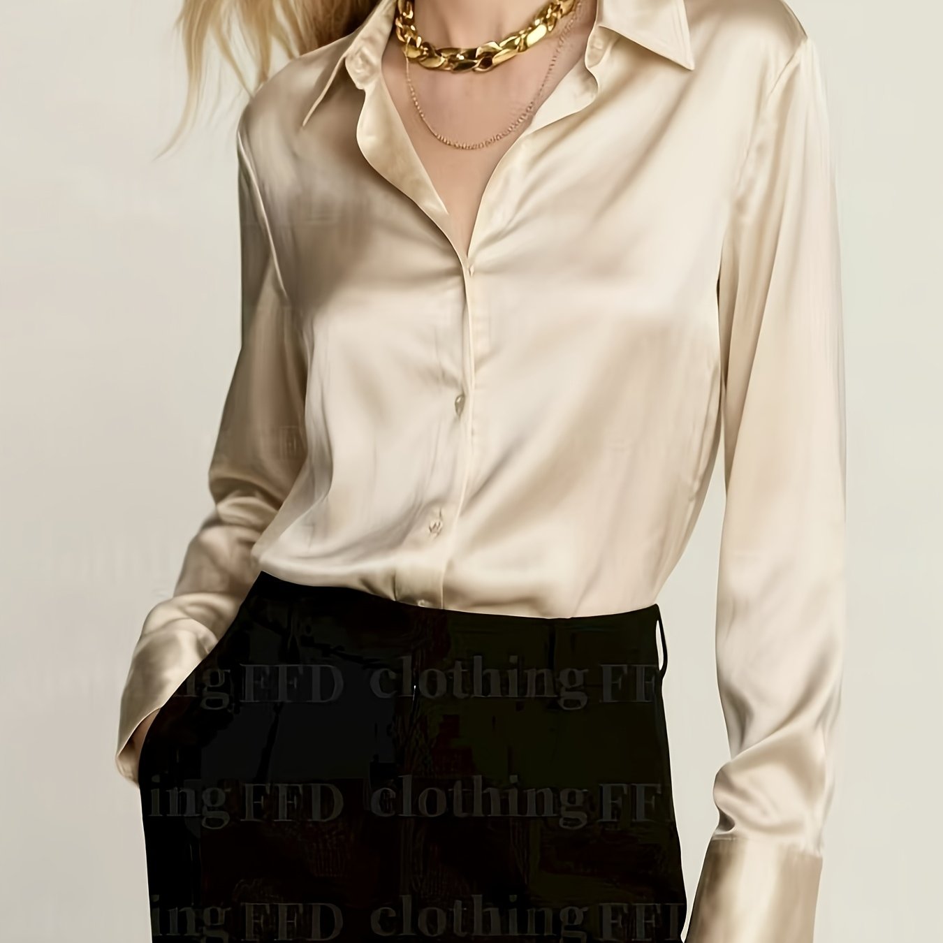 TEMU 여성용 우아한 솔리드 베이지/화이트/브라운/블랙/다크 그레이 칼라 블라우스 - 고급 새틴 롱 슬리브 셔츠 재킷 스타일 버튼 프론트 코트, 사계절 착용, 웨딩 & 포멀 이벤트 (세탁기 사용 가능)