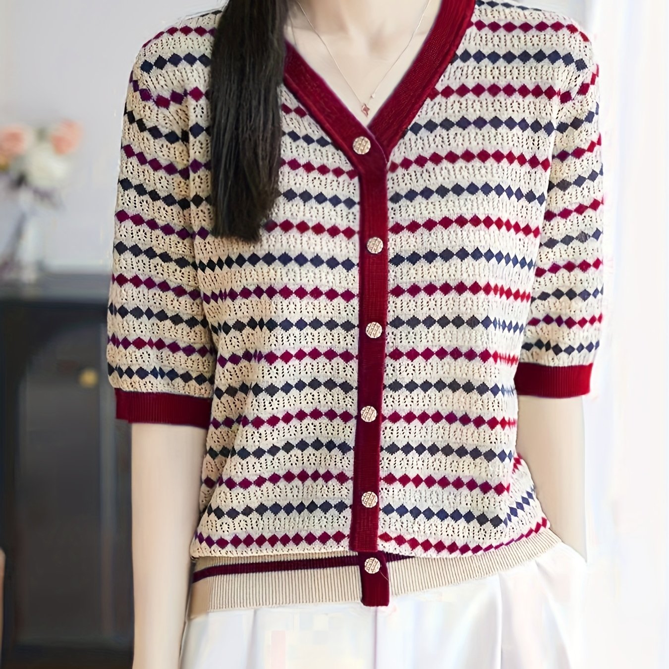 TEMU 우아하고 스타일리시한 컬러블록 브이넥 반팔 페이크 가디건 탑, 신상 여름 도착품