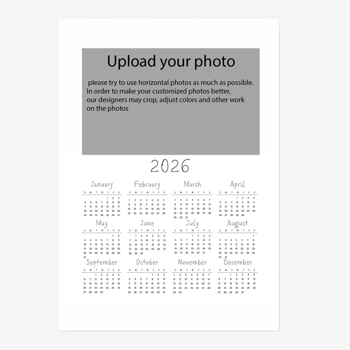 TEMU 2026년 맞춤형 사진 캘린더용 2D 플랫 템플릿, 단일 페이지 디자인, 사진 벽걸이 캘린더에 적합, 캔버스 재질, 친구 및 동료를 위한 새해 선물로 이상적, 즉시 걸 수 있는 프레임 포함