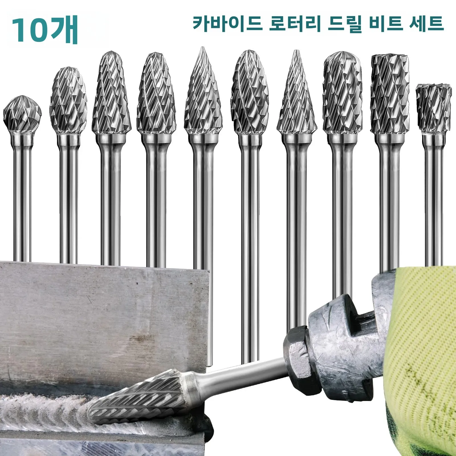 10pcs 카바이드 버 세트, 경질 합금 텅스텐 강철 더블 컷 로터리 파일 밀링 커터 헤드, 목공 그라인딩 Carvin