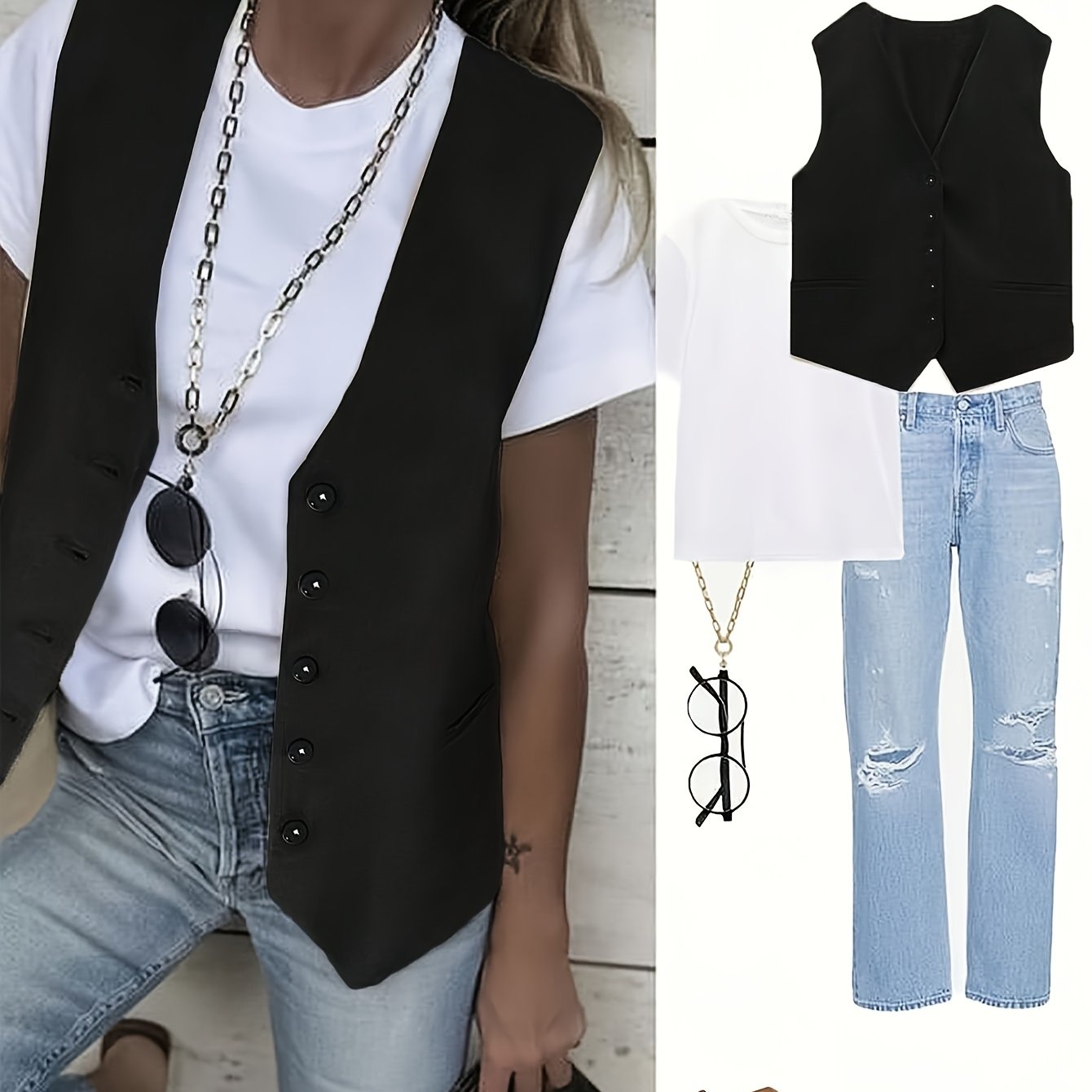 TEMU 우아한 단색 여성 조끼 | 패셔너블한 비대칭 플리츠 V넥 버튼 디테일, 사계절 및 특별한 날에 이상적
