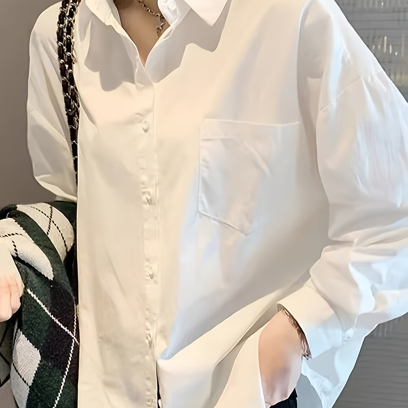 TEMU 솔리드 컬러 버튼셔츠 - 루즈핏 드롭 숄더 롱슬리브 블라우스, 솔리드 컬러 버튼프론트 플라켓, 캐주얼 & 프로페셔널 웨어를 위한 봄/가을 필수 아이템, 세탁기 사용 가능한 논스트레치 셔츠