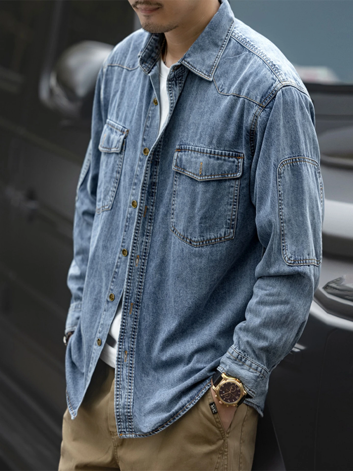 워싱 데님 긴팔 남성 셔츠 빈티지 워크웨어 스타일 봄 가을 패셔너블한 다용도 아우터웨어 청년 트렌드 면 혼방