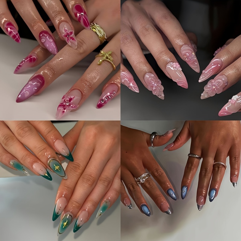 TEMU 96개입 아몬드형 3D 물방울 글리터 스타 인조네일 세트, 모든 여성에게 적합 - 네일 파일 및 젤리 접착제 포함
