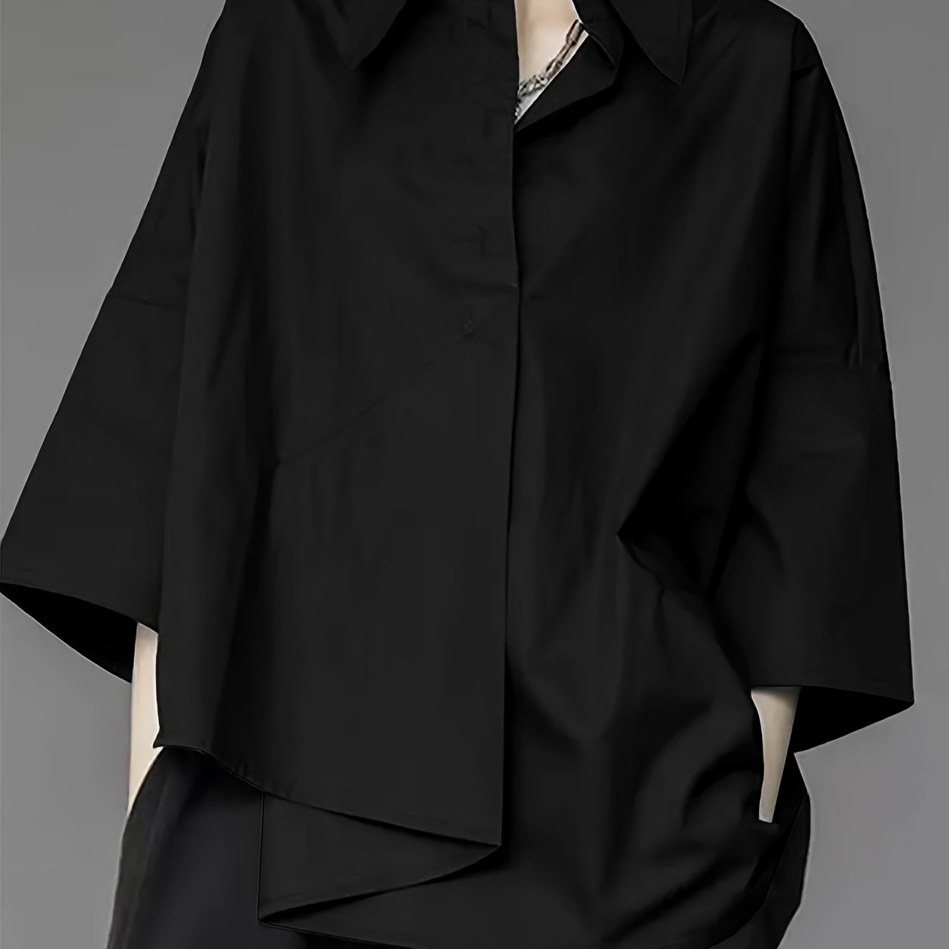 TEMU 여름/가을을 위한 여성용, 모델 LL425의 유니크하고 스타일리시한 루즈핏의 불규칙한 블랙 셔츠. 게으른 분위기를 연출합니다.