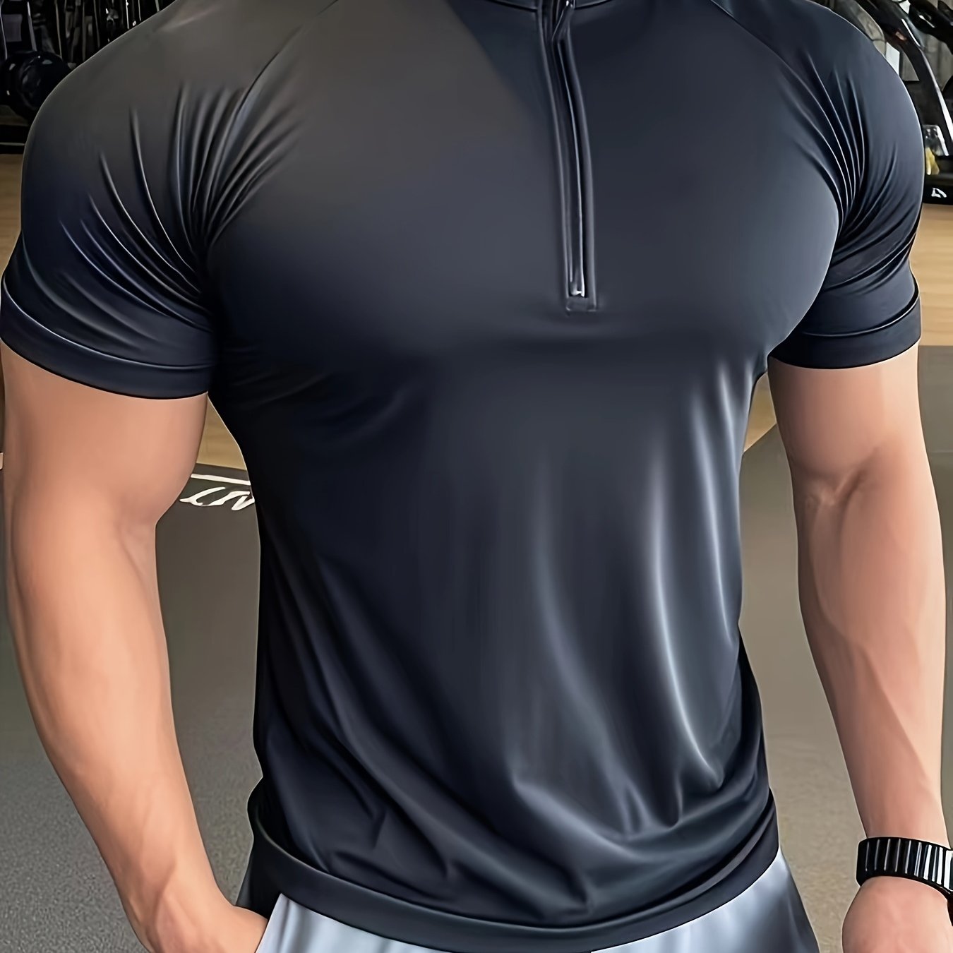 TEMU 남성용 슬림핏 하프 지퍼 스탠드 칼라 티셔츠 - 운동용 지퍼 캐주얼 셔츠, 체육관 및 캐주얼 복장용 통기성 반팔, 솔리드 블랙/화이트/다크 그레이 - 컨투어링 핏 (쉬운 관리)
