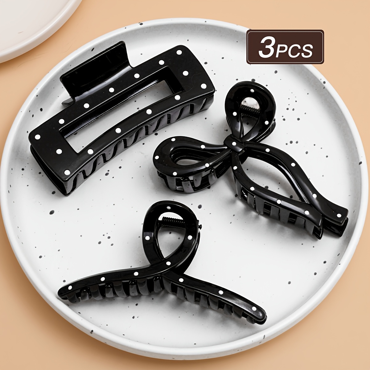 TEMU 여성용 블랙 물방울무늬 헤어 클로 3개 세트 (사각형, 리본, 모양), 스타일리시하고 활용도 높은 대형 헤어 클립. 데일리 캐주얼, 쇼핑, 파티, 데이트에 적합. 여성용 헤어 액세서리, 발렌타인데이 헤어 장식, 선물