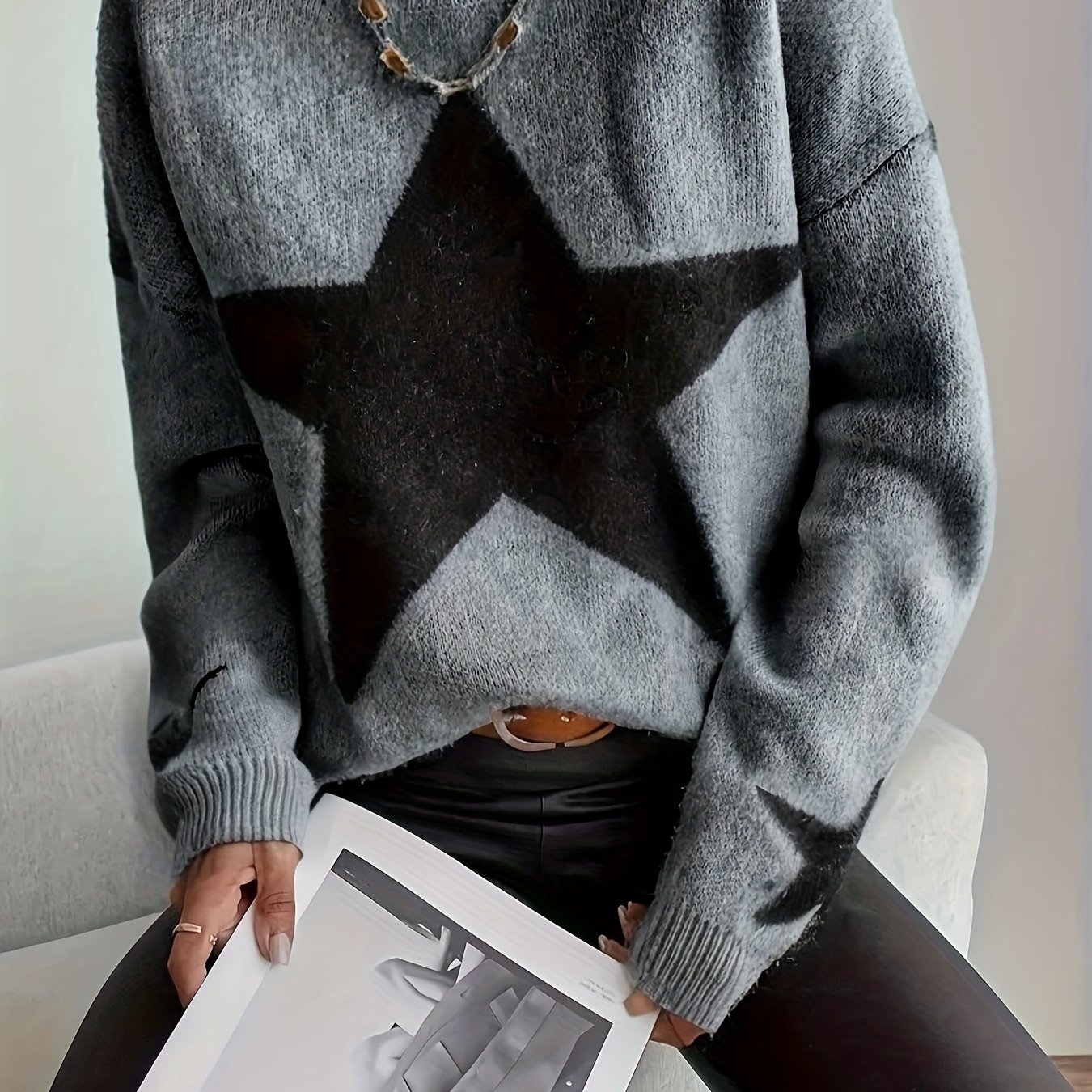 TEMU 가을, 겨울용 별 패턴 스웨터, 컬러 블록 디자인, 우아한 긴소매 라운드넥 풀오버, 여성용 스웨터.