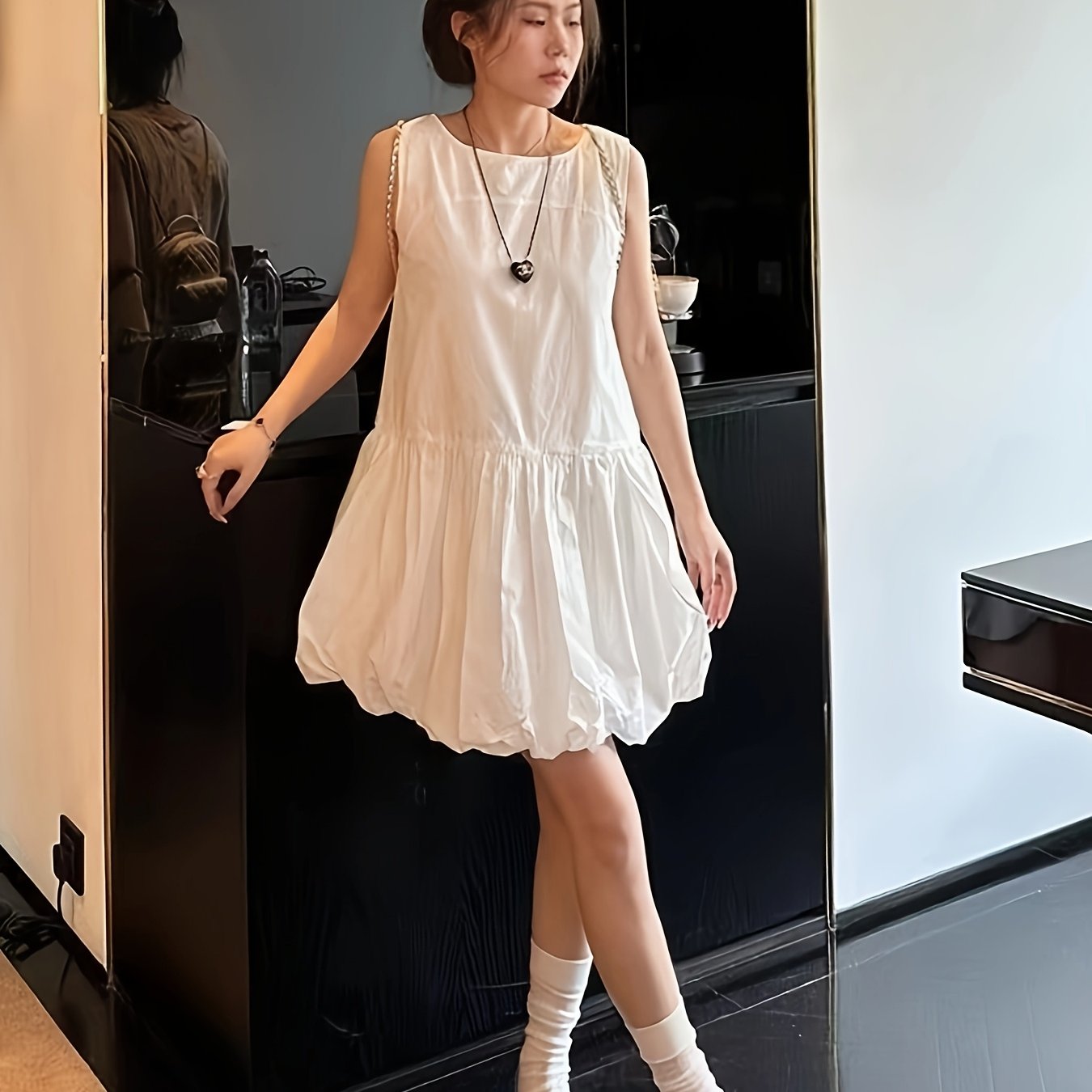 TEMU 여성용 우아한 프렌치 스타일 민소매 화이트 탱크 드레스 - 러플 디테일이 있는 플리츠 미니 스커트, 봄/여름/가을에 완벽, 캐주얼부터 포멀웨어까지, 캐주얼 의상|러플 헴라인|플리츠 디테일|여름원피스|나시원피스|민소매원피스