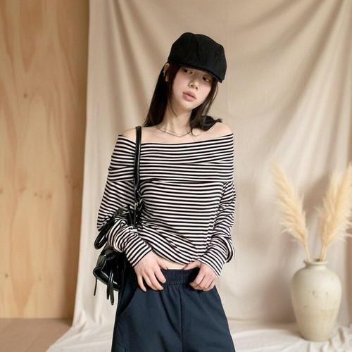 [옷자락]여성 기본 스트라이프 오프숄더 긴팔 티