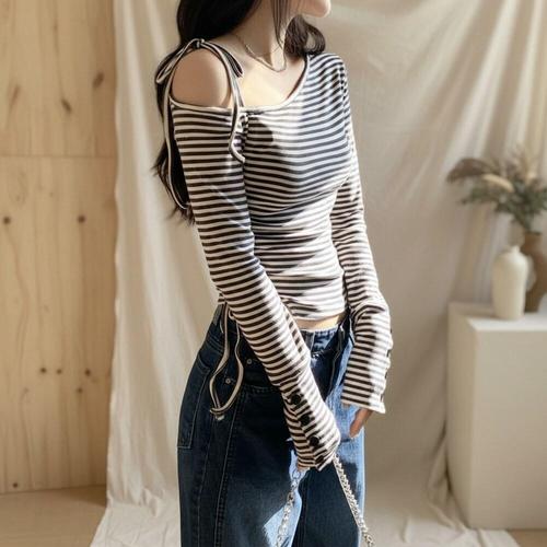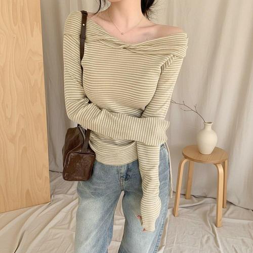 [옷자락]여성 슬림핏 스트라이프 셔링 오프숄더 긴팔 티셔츠