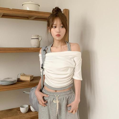 TEMU 봄/여름 한국 스타일 불규칙 허리 주름 오프숄더 슬림 반팔 탑
