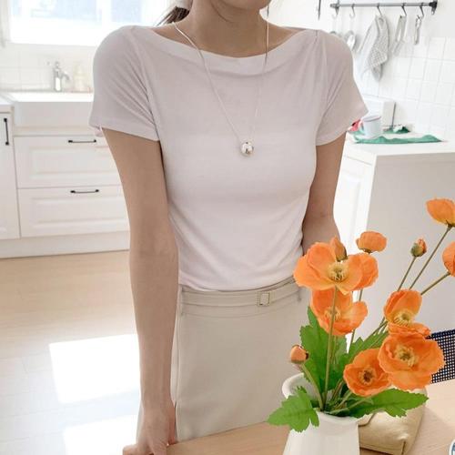 [옷자락]여자 쫀쫀한흰색상의 딱붙티 슬림핏 보트넥 티셔츠