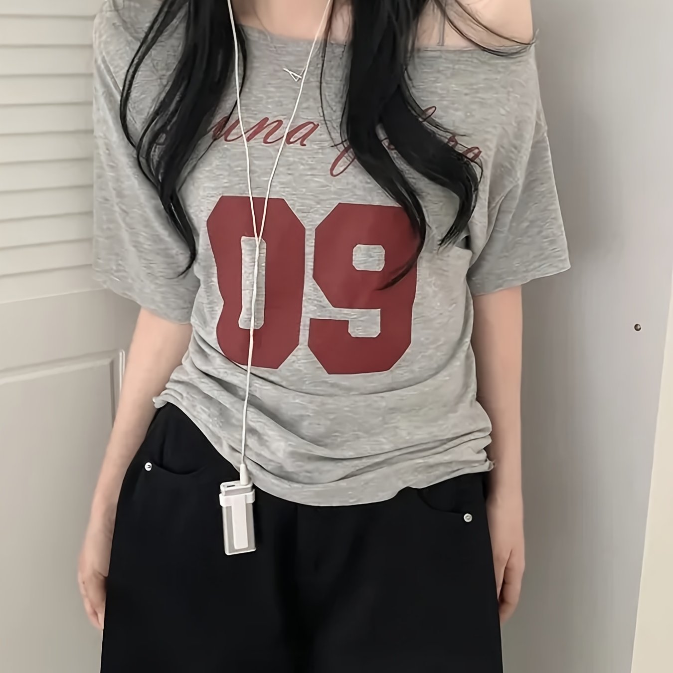 TEMU 한국 스타일 오프숄더 레터 프린트 로우웨이스트 등 디자인 소프트 루즈핏 반팔 상의