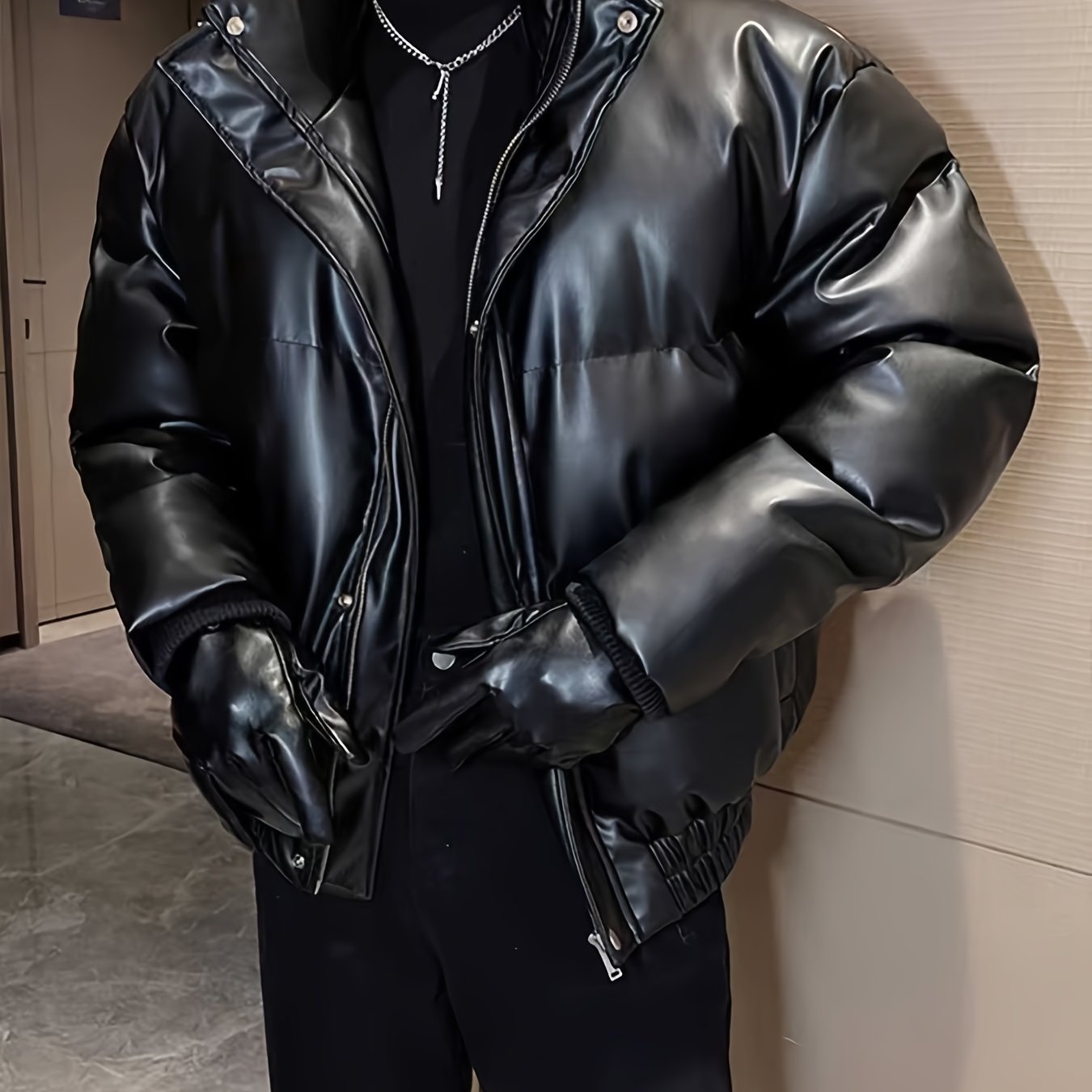 TEMU PU 재킷 남성용 블랙 숏 겨울 신상 스타일 코트 트렌디 코트 방한 패션 버튼 스타일 지퍼 재킷, 멀티 포켓 디자인, 겨울 일상복 및 특별한 날에 적합, 우아한 캐주얼 남성용 재킷 방한 코트