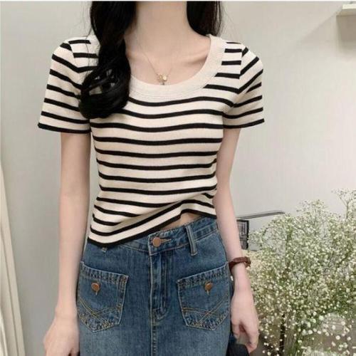 [셀러허브_여성트랜드패션]ONM U넥 세미크롭 골지 스트라이프 반팔니트티